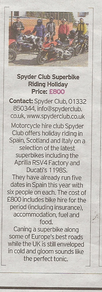 Spyder Club Superbike Riding Holiday, Kevin Ash, Daily Telegraph