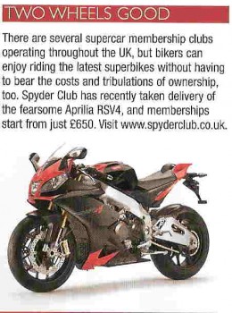 Two Wheels Good, Performance Car The post Two Wheels Good, Performance Car appeared first on Spyder Motorcycles. Lizzi Smith Young29 September 2009Editorial, spyder club